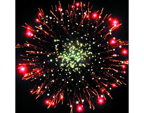 Мощнейшая ракета в отдельной упаковке. Множество золотых ниспадающих нитями звезд (парча), красное мерцание и белый мерцающий центр.